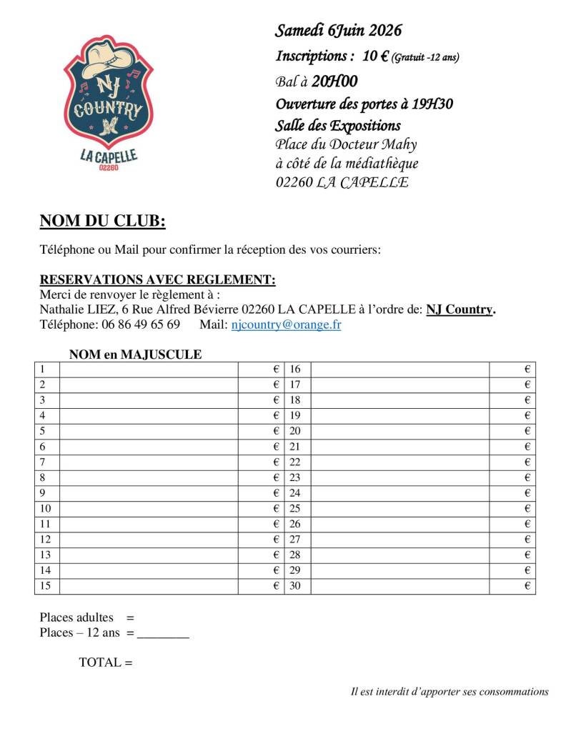 Bal organisé par NJ Country, Les réservations sont ouvertes et obligatoires.